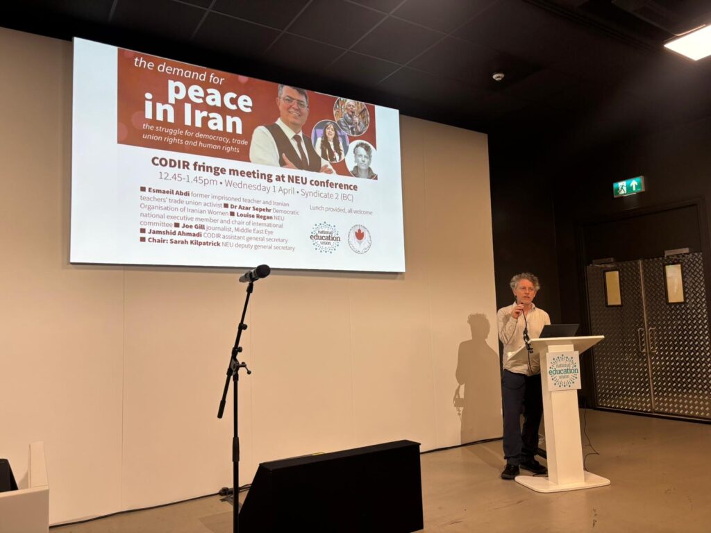 Codir assistant general secretary Jamshid Ahmadi hailed the NEU conference as one of the few occasions on which British trade unions have discussed Iran as a serious issue, and called for international mobilisation to stop the war which “is already a catastrophe for the people of Iran and the region.”